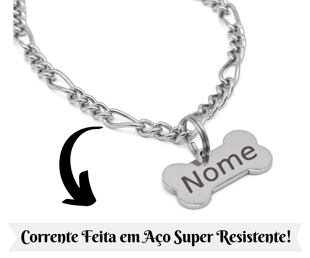 Esta corrente é perfeita para o seu pet! Ela acompanha um lindo pingente em inox ou alumínio em formato de osso para identificação. Personalize o pingente com o nome do seu pet e seu telefone para que você possa ser contatado em caso de perda.